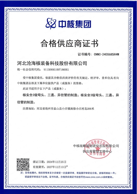 近日,河北滄海核裝備科技股份有限公司成功通過(guò)中核戰(zhàn)略規(guī)劃研究總院有限公司供應(yīng)商資格考察評(píng)審,正式獲得中核集團(tuán)合格供應(yīng)商資質(zhì)。